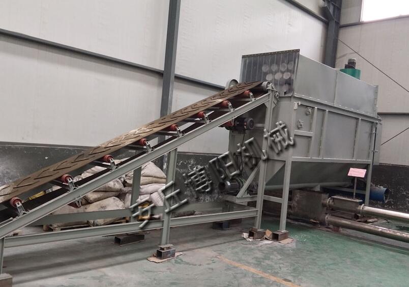 袋裝粉粒體物料由皮帶輸送機傳送至45度角的滑板并依靠重力沿滑板下滑,在下滑過程中由快帶轉(zhuǎn)動的刀片將包裝袋割開,被割開的殘袋和物料骨入滾筒篩進行篩分。從滾筒篩落下的物料由螺旋輸送機輸出,破損的包裝袋、雜質(zhì)、結(jié)塊物料被滾筒篩帶出機體,割刀破袋過程中引起的粉塵由布袋式除塵器捕捉并抖落入螺旋輸送機。